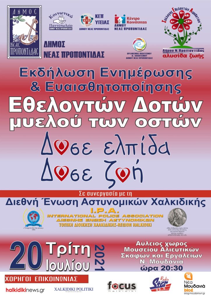 Ο Δήμος Ν. Προποντίδας σε συνεργασία με τη Διεθνή Ένωση Αστυνομικών Χαλκιδικής διοργανώνει εκδήλωση Ενημέρωσης και Ευαισθητοποίησης για τους Εθελοντές Δότες Μυελού των Οστών: “Δώσε ελπίδα, δώσε Ζωή”, αύριο Τρίτη 20 Ιουλίου 2021 και ώρα 20:30 στον αύλειο χώρο του Μουσείου Αλιευτικών Σκαφών και Εργαλείων στα Ν. Μουδανιά.