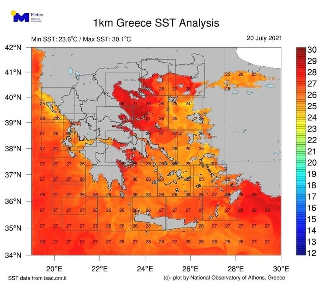 Συγκεκριμένα, αναφέρει: “Σοκαριστικές οι θερμοκρασίες επιφανείας της θάλασσας όπως μετρήθηκαν σήμερα από μετεωρολογικό δορυφόρο. Οι θερμοκρασίες ειδικά στο ΒΔκο Αιγαίο και τον Θερμαϊκό/Χαλκιδική είναι στους 28-29 βαθμούς, και τοπικά έως 30 (!!!!!).