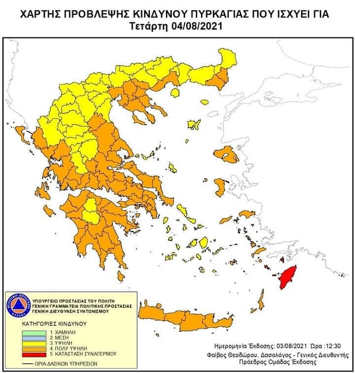 Σύμφωνα με τον Ημερήσιο Χάρτη Πρόβλεψης Κινδύνου Πυρκαγιάς, που εκδίδει η Γενική Γραμματεία Πολιτικής Προστασίας του Υπουργείου Προστασίας του Πολίτη (www.civilprotection.gr), για αύριο Τετάρτη 04/08/2021, προβλέπεται πολύ υψηλός κίνδυνος πυρκαγιάς (κατηγορία κινδύνου 4) στην Π.Ε. Χαλκιδικής.