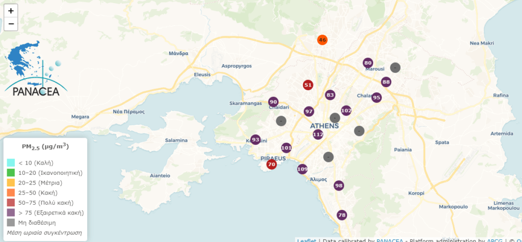 Ο χάρτης παρουσιάζει τα ωριαία επίπεδα συγκεντρώσεων των σωματιδίων PM2.5 σε μικρογραμμάρια ανά κυβικό μέτρο αέρα. Τα στοιχεία προέρχονται από το δίκτυο αισθητήρων του Ινστιτούτου Ερευνών Περιβάλλοντος του Εθνικού Αστεροσκοπείου Αθηνών (ΙΕΠΒΑ/ΕΑΑ), που λειτουργεί στο πλαίσιο της Εθνικής Ερευνητικής Υποδομής ΠΑΝΑΚΕΙΑ της Γενικής Γραμματείας Έρευνας και Καινοτομίας και σε συνεργασία με την Περιφέρεια Αττικής.