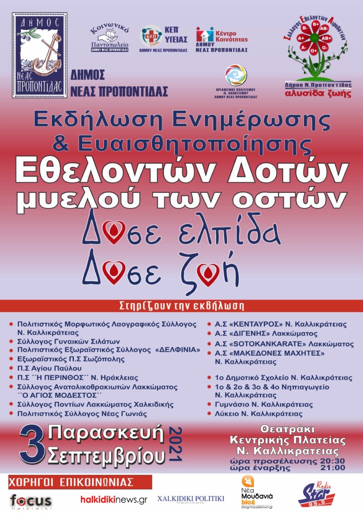 Ο Δήμος Ν. Προποντίδας διοργανώνει Εκδήλωση ενημέρωσης και ευαισθητοποίησης με θέμα: “Δώσε ελπίδα, δώσε Ζωή”, την Παρασκευή 3 Σεπτεμβρίου 2021 και ώρα 21.00 στην κεντρική πλατεία της Ν. Καλλικράτειας.