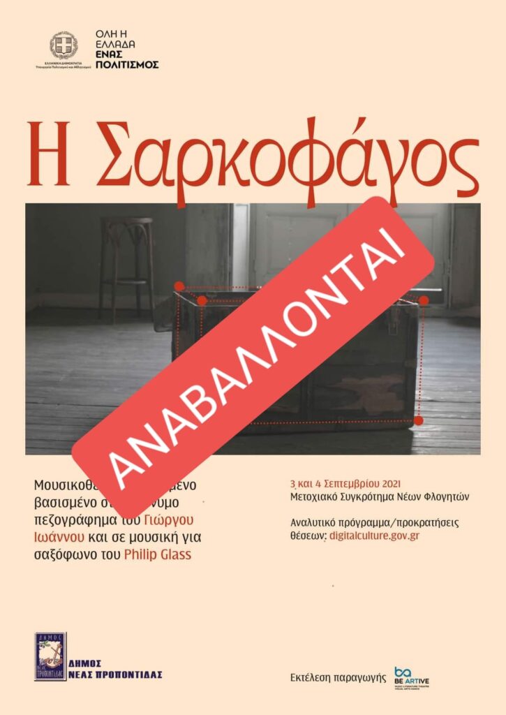 Το μουσικοθεατρικό δρώμενο “Η Σαρκοφάγος”, βασισμένο στο ομώνυμο πεζογράφημα του Γιώργου Ιωάννου και σε μουσική για σαξόφωνο του Philip Glass, που ήταν προγραμματισμένο για τις 3 και 4 Σεπτεμβρίου 2021 στο Μετοχιακό Συγκρότημα Ν. Φλογητών ΑΝΑΒΑΛΛΕΤΑΙ μετά από απόφαση του Υπουργείου Πολιτισμού λόγω της κήρυξης του 3ημερου εθνικού πένθους για την απώλεια του Μίκυ Θεοδωράκη.