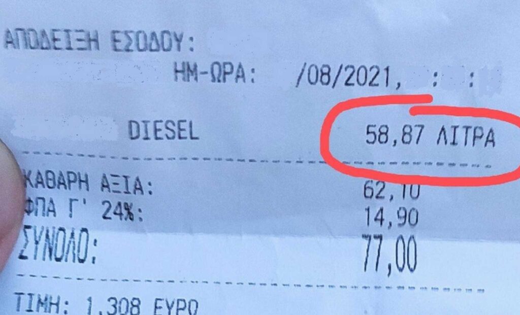 2) Το καύσιμο που μπήκε στο ρεζερβουάρ, σύμφωνα με την απόδειξη, ήταν 58,89 λίτρα.