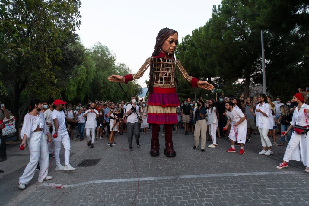 Μικροί και μεγάλοι, τηρώντας τα μέτρα προστασίας για τον κορωνοίό, συγκεντρώθηκαν στην πλατεία Ασωμάτων στο Μοναστηράκι και συνόδευσαν την κούκλα ύψος 3,5 μέτρα, η οποία διανύει ένα μεγάλο ταξίδι 8.000 χιλιομέτρων με τελικό προορισμό το Μάντσεστερ στην Αγγλία. Είχε προηγηθεί κάλεσμα περιφρούρησης της πορείας της από αντιφαστιστικές συλλογικότητες και οργανώσεις (σχετική ανακοίνωση από τον Αντιφασιστικό Συντονισμό, την Ανοιχτή Πόλη, αλλά και τον Πειραιά για Όλους για το Σαββατοκύριακο).