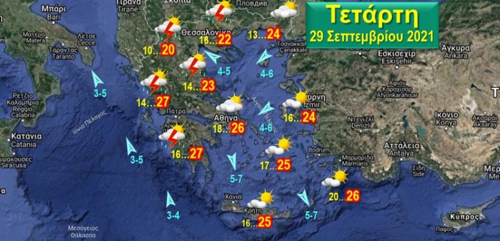 Συννεφιά με διαστήματα ηλιοφάνειας, τοπικές βροχές και λίγες μεμονωμένες καταιγίδες στο Ιόνιο, την Ήπειρο, τη δυτική και κεντρική Μακεδονία, τα ορεινά της Θεσσαλίας, τη δυτική και κεντρική Στερεά και τη δυτική Πελοπόννησο. Σχεδόν αίθριος καιρός στις υπόλοιπες περιοχές. Οι άνεμοι στο Ιόνιο Ανατολικοί 3-5, στο Αιγαίο Βοριάδες 5-7 Μποφόρ. Η θερμοκρασία σε πτώση με τις μέγιστες τιμές στους 23-25 βαθμούς.