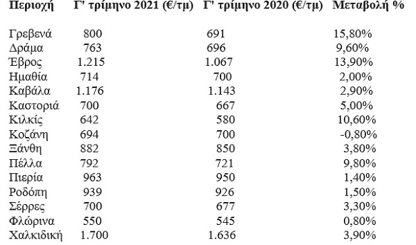 Στον αντίποδα βρίσκεται η Φλώρινα με μέση τιμή πώλησης που αγγίζει τα 550 ευρώ ανά τμ και οριακή άνοδο έναντι του τρίτου τριμήνου του 2020 που δεν ξεπερνά το 0,8%.