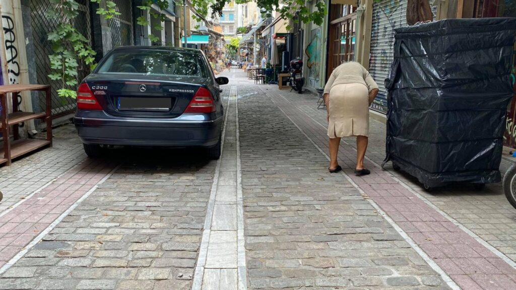 Ένα πλακόστρωτο σπασμένο οριακά επικίνδυνο για να πέσει πεζός, αυτοκίνητα και μηχανάκια παρκαρισμένα σε όλο το μήκος του πεζόδρομου, έχοντας κάνει κατάληψη σε οποιοδήποτε κενό πεζούλι υπάρχει για να κοντοσταθείς και αυτό ακόμη δεν θα μπω στην διαδικασία να το σχολιάσω διότι όταν η μεγαλύτερη πλατεία της πόλης μου είναι χιλιοπαρκαρισμένη καθημερινά δυστυχώς όχι δεν μου κάνει καμία εντύπωση το τι συμβαίνει σε έναν μικρό πεζόδρομο. Τα παρκαρισμένα αυτοκίνητα σε συνδυασμό με τα παρατημένα έπιπλα, τα οποία βρίσκονται για μήνες πάνω της, τα σκουριασμένα σίδερα κατά μήκος της, τα δύο σταθμευμένα καρότσια σε απέναντι γωνιές, ολοκληρώνουν την εικόνα της απογοήτευσης των περαστικών που την επέλεξαν, για έναν ξεχωριστό περίπατο.