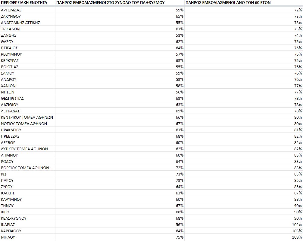 Αντίθετα, μόλις 6 Περιφερειακές Ενότητες έχουν καταφέρει να υπερβούν το 70%, με πρωταθλήτρια τη Μύκονο (80%) και ακολουθούν η Σαντορίνη (79%), η Μήλος (75%), η Πάρος (73%) και η Κως (73%). Τέλος, στην πρωτεύουσα, αρνητική πρωτιά στους εμβολιασμούς έχει η Δυτική Αττική με 45%, ακολουθούν η Ανατολική Αττική με 55%, ο Δυτικός Τομέας Αθηνών με 62%, ο Κεντρικός και Νότιος Τομέας με 66% και 67% αντίστοιχα, ενώ την κούρσα σέρνει ο Βόρειος Τομέας με 72%.