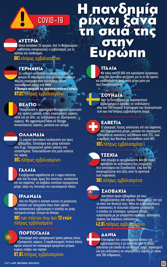 Η Αυστρία έγινε η πρώτη ευρωπαϊκή χώρα, η οποία από την περασμένη Δευτέρα έθεσε σε ισχύ lockdown για τους περίπου δύο εκατομμύρια ανεμβολίαστους, ενώ χθες έγινε και η πρώτη χώρα της δυτικής Ευρώπης που επέβαλε εκ νέου ολικό, εθνικό lockdown, το οποίο περιλαμβάνει και τους εμβολιασμένους πολίτες.