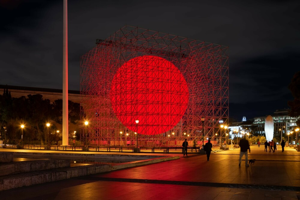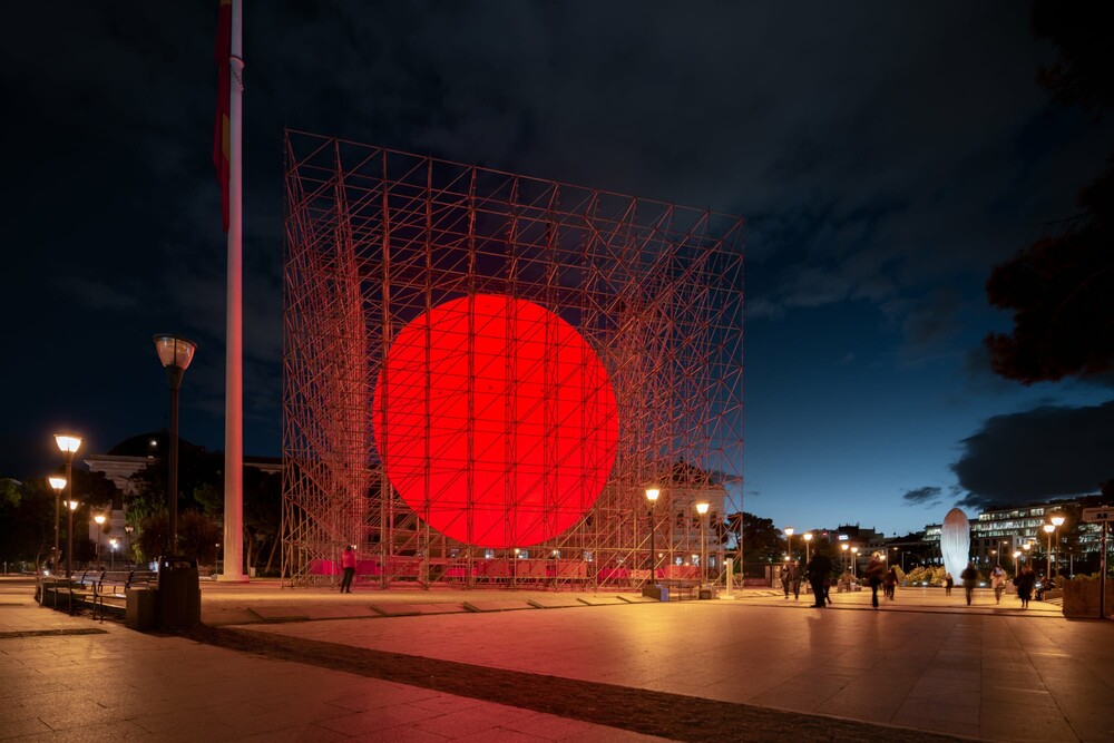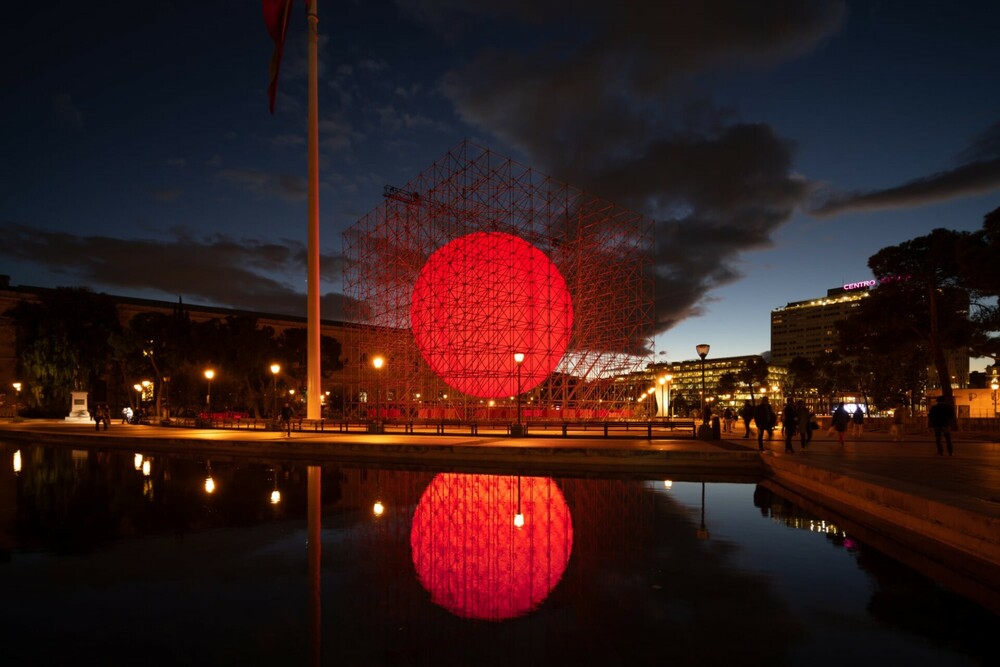 Τα δύο στοιχεία σχηματίζουν μια μεγάλη κατασκευή που έχει ύψος σχεδόν 25 μέτρα. Τραβά την προσοχή των περαστικών που βλέπουν ένα ισχυρό κόκκινο φως μέσα από μια βιομηχανική σκαλωσιά, σαν ένα σήμα κινδύνου, αλλά και ένα εορταστικό μήνυμα. Ο κοινός τύπος της σκαλωσιάς που τον βλέπουμε σε εργοτάξια αλλά και μέσα στον αστικό ιστό δημιουργεί μια επιβλητική σε ύψος δομή, ενώ η μπάλα που ακτινοβολεί κόκκινο φως και συμβολίζει τη γη εκπέμπει θερμότητα.