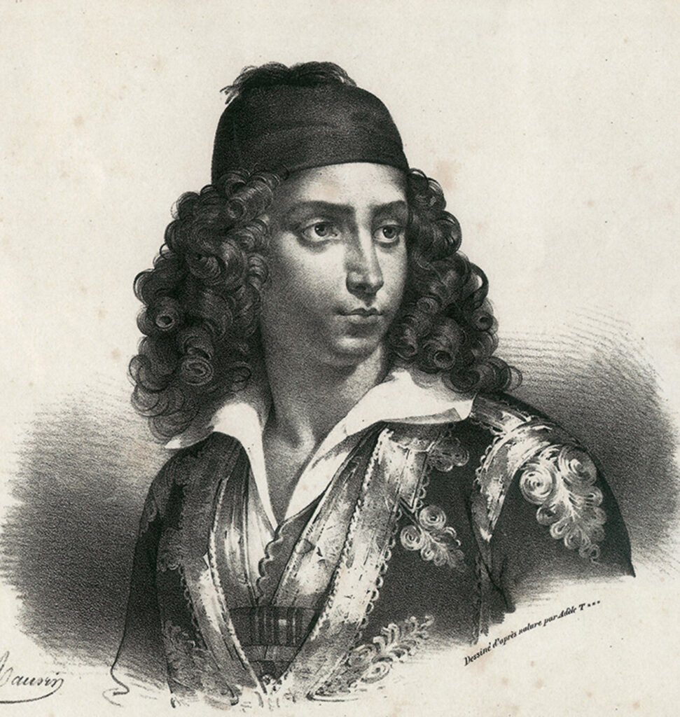 «Μεταξύ των νεαρών Ελλήνων που μετέβησαν στη Γαλλία για σπουδές ήταν ο μεγαλύτερος γιος του Χατζή Αντώνη και της Δόμνας Βισβίζη. Ο Δημήτριος Βισβίζης κέρδισε τον θαυμασμό των Γάλλων και έγινε το αγαπημένο παιδί των φιλελληνικών κύκλων της πόλης, ενώ κυρίες της αριστοκρατίας, όπως η Juliette Récamier και η Laure Junot, δούκισσα του Abrantès, τον έθεσαν υπό την προστασία τους. Το 1826 η ζωγράφος Adèle Tardieu, εντυπωσιασμένη από την ομορφιά του, φιλοτέχνησε το πορτρέτο του, το οποίο λιθογραφήθηκε και πουλήθηκε υπέρ των Ελλήνων. Η λιθογραφία συνοδεύεται από μια αλληγορική σκηνή αποχαιρετισμού και τα υποτιθέμενα λόγια της μητέρας του, κατά την αναχώρησή του: “Η Γαλλία με τη γενναιοδωρία της θα σε υιοθετήσει, θα σε αναθρέψει, θα σε εκπαιδεύσει. Όταν επιστρέψεις ίσως δεν θα υπάρχω. Να θυμάσαι ότι οφείλεις να εκδικηθείς για τον πατέρα σου”.