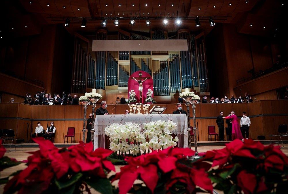 Ο Πάπας Φραγκίσκος τέλεσε Θεία Λειτουργία στην κεντρική αίθουσα του Μεγάρου Μουσικής «Χρήστος Λαμπράκης», όπου βρίσκεται το μεγαλύτερο εκκλησιαστικό όργανο των Βαλκανίων. Τη Λειτουργία παρακολουθούν από όλες τις άλλες αίθουσες του Μεγάρου Μουσικής, έως 2500 άτομα.