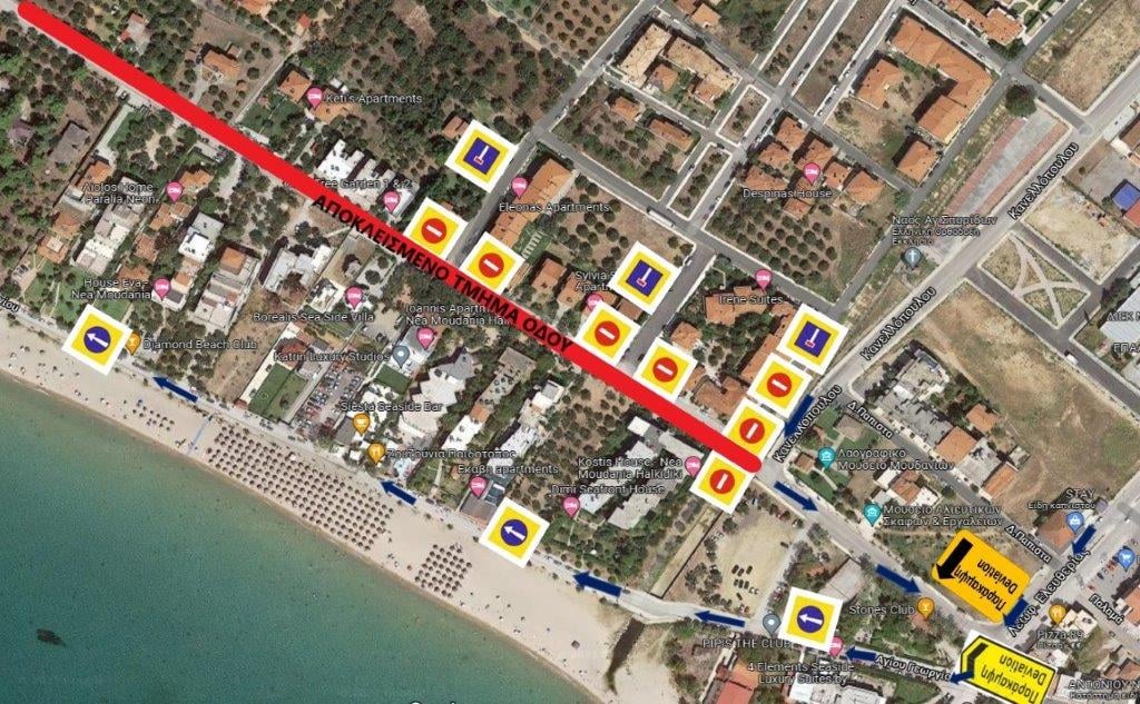 Α) η κίνηση των οχημάτων από Ν. Μουδανιά προς Ν. Φλογητά θα γίνει από την παραλιακή οδό (επέκταση οδού Αγίου Γεωργίου). Τα οχήματα από την οδό Κανελλοπούλου και από την οδό Λεωφόρο Ελευθερίας , θα οδηγηθούν από την είσοδο του Λιμένα Ν. Μουδανιών (κατάστημα STONES) με δεξιόστροφη κίνηση προς την επέκταση της οδού Αγίου Γεωργίου και από εκεί μέχρι το ύψος του καταστήματος CONCHA, θα ακολουθήσουν τη διαδρομή μέχρι το τέλος της παράκαμψης. Η παραπάνω κίνηση από το ύψος της εισόδου του ξενοδοχείου μέχρι την διασταύρωση της παραλιακής με την 1η κάθετη οδό είναι μονόδρομη.