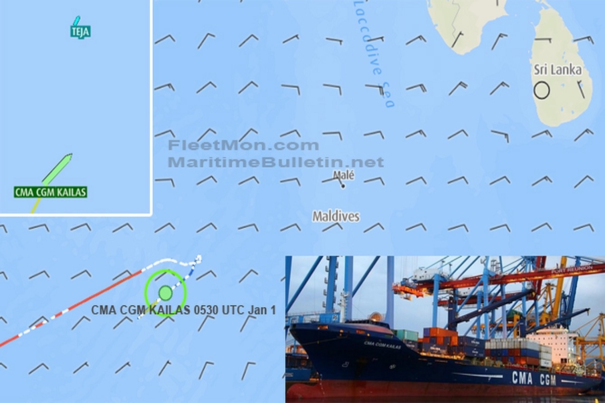 Το πλοίο μεταφοράς εμπορευματοκιβωτίων CMA CGM KAILASέμεινε ακυβέρνητο στις 20 Δεκεμβρίου, και ενώ βρισκόταν περίπου 395 nm ΝΔ του Μαλέ στις Μαλδίβες.