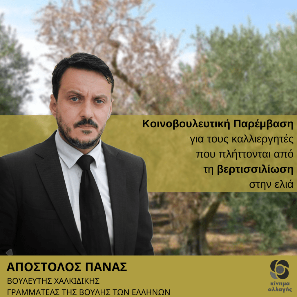 Ερώτηση κατέθεσε ο Βουλευτής Χαλκιδικής και Υπεύθυνος Κοινοβουλευτικού Τομέα Αγροτικής Ανάπτυξης του Κινήματος Αλλαγής Απόστολος Πάνας, προς τον Υπουργό Αγροτικής Ανάπτυξης και Τροφίμων, με κύριο θέμα τις καταστροφικές συνέπειες της μυκητολογικής ασθένειας «Βερτισιλλίωση (Verticillium dahlie)» στην ελαιοκαλλιέργεια και τις επιπτώσεις της στις εισροές των παραγωγών και στην Εθνική Οικονομία.