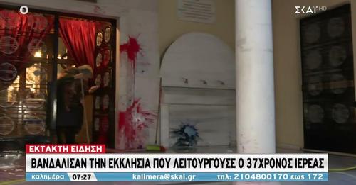 Άγνωστοι βανδάλισαν τον ιερό ναό του Αγίου Δημητρίου των Όπλων στα Κάτω Πατήσια, τον οποίο λειτουργούσε ο 37χρονος ιερέας που κατηγορείται για κατ’ εξακολούθηση βιασμό μιας ανήλικης καθώς και για σχετική πορνογραφία.