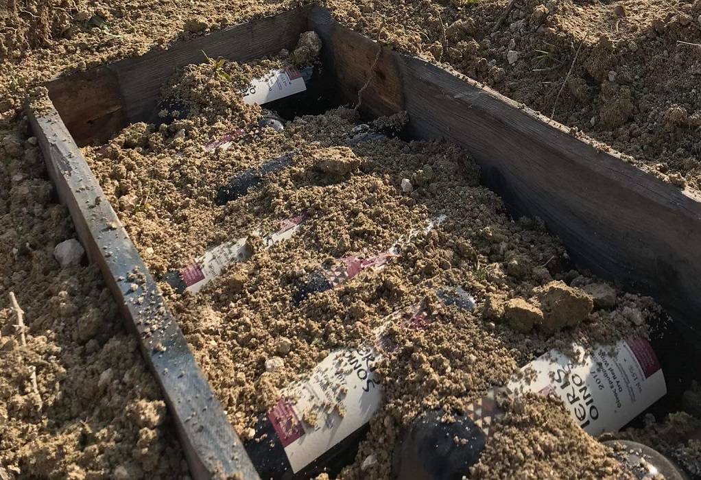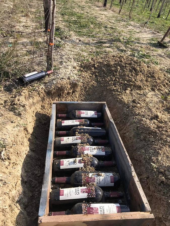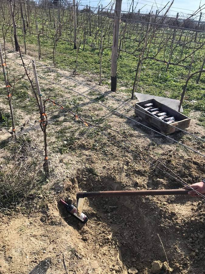 Ήδη, τα πρώτα μπουκάλια με κόκκινο κρασί, εσοδείας του 2017, φυτεύτηκαν διπλά στις ρίζες, αφού τοποθετήθηκαν μέσα σε ειδικές κατασκευές κι ενώ έγιναν νωρίτερα όλες οι προεργασίες και οι μετρήσεις. Στην «αγκαλιά» της γης και θα μείνουν τουλάχιστον δώδεκα μήνες.