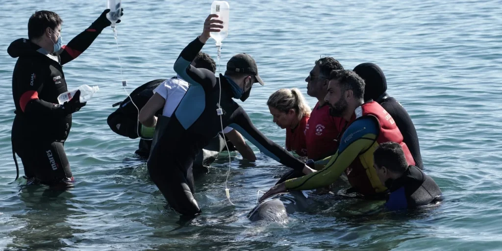 Πολύωρες και συγκινητικές προσπάθειες καταβάλλουν οι διασώστες για να κρατήσουν στη ζωή το είδος φάλαινας που ξεβράστηκε στις ακτές του Αλίμου.