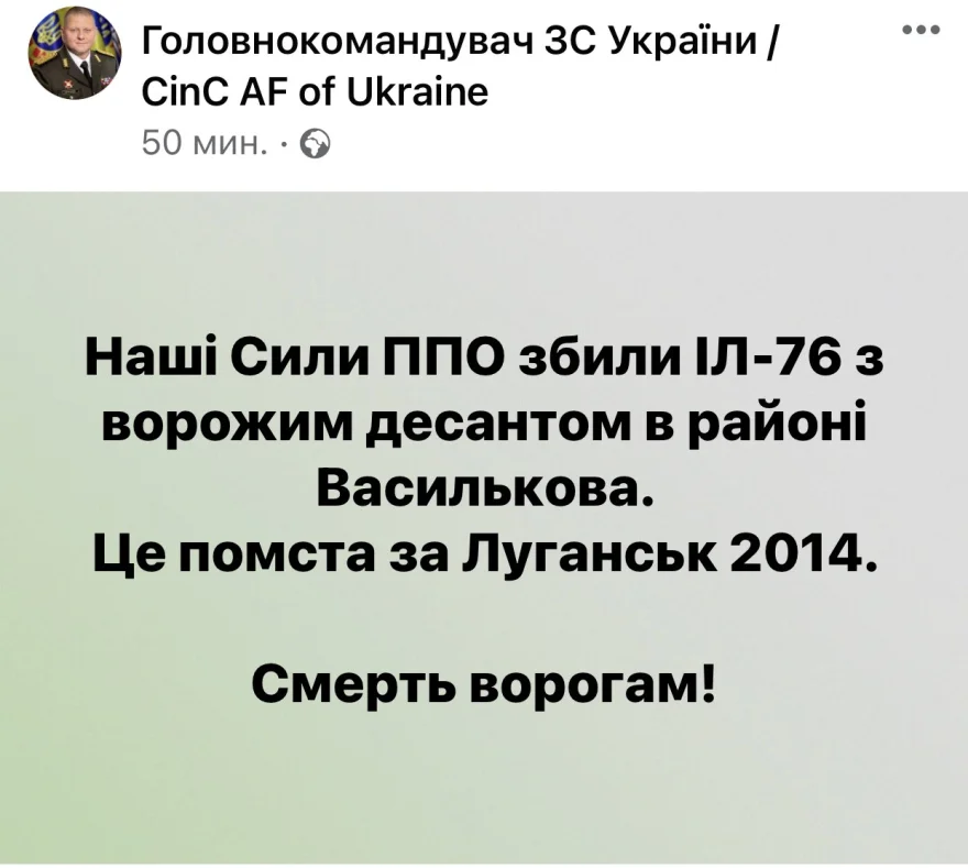 Η ουκρανική αντιαεροπορική άμυνα κατέρριψε ένα ρωσικό στρατιωτικό αεροσκάφος Ιλιούσιν Il-76 που μετέφερε αλεξιπτωτιστές, κοντά στην περιοχή Βασίλκιβ, σύμφωνα με ανάρτηση του Αρχηγού των Ενόπλων Δυνάμεων της Ουκρανίας στο Facebook λίγα λεπτά πριν από τη 01:00 (ώρα Ελλάδος).