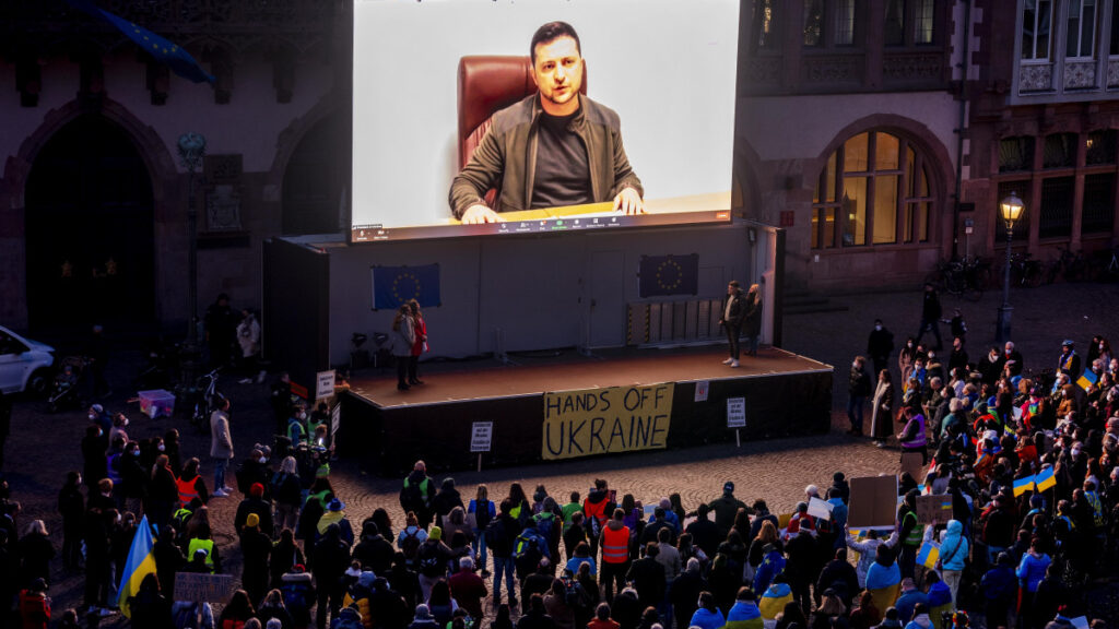 Το μήνυμα του Ουκρανού Προέδρου προβλήθηκε σε αντιπολεμικές διαδηλώσεις μέσω γιγαντοοθονών που είχαν τοποθετηθεί σε πόλεις του κόσμου όπως η Πολωνίας, η Γεωργίας, η Γερμανία, η Γαλλία και η Ουγγαρία.