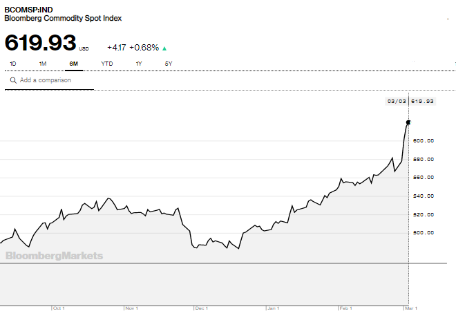 Ο δείκτης εμπορευμάτων του Bloomberg (BCOM, κατέγραψε άνοδο άνω του 9% την εβδομάδα 23 Φεβρουαρίου – 4 Μαρτίου και αναμένεται να συνεχίσει να κινείται υψηλότερα