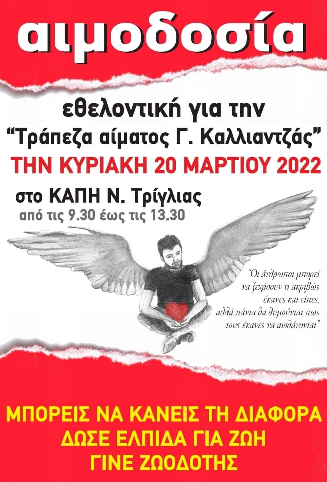Εθελοντική αιμοδοσία για την τράπεζα αίματος “Γ. Καλλιαντζάς” Νέας Τριγλίας την Κυριακή 20 Μαρτίου 2022 και ώρες 9:30 έως 13:30 στο ΚΑΠΗ Νέας Τριγλίας.