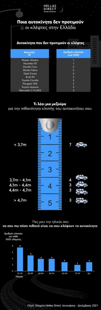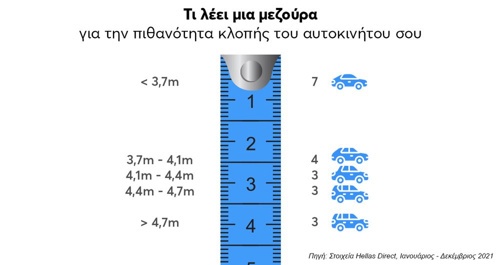 Σωστά. Όσο πιο μικρό το μήκος του αυτοκινήτου σου, τόσο πιο πιθανό να γίνει στόχος των επίδοξων ληστών. Για την ακρίβεια, ένα ΙΧ κάτω των 3,7 μέτρων έχει πάνω από διπλάσιες πιθανότητες να κλαπεί απ’ ότι ένα μεσαίο ή μεγάλο ΙΧ (4,1m και άνω).