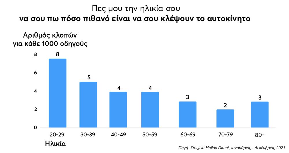 Τι μας λέει λοιπόν ο παραπάνω πίνακας; Για κάθε 1.000 οδηγούς ηλικίας 20-29 που είχαν ασφαλισμένο το ΙΧ τους στην Hellas direct το 2021, συνέβησαν 8 περιπτώσεις κλοπών μερικής ή ολικής, αριθμός τουλάχιστον διπλάσιος από τις ηλικίες οδηγών 40 ετών και πάνω.
