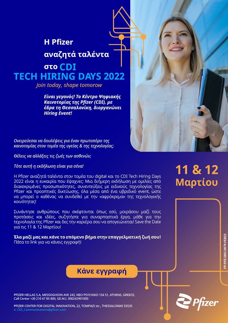 Ο φαρμακευτικός κολοσσός αναζητά ταλέντα στον τομέα του digital και το CDI Tech Hiring Days 2022 μέσα από μια διήμερη εκδήλωση (11 και 12 Μαρτίου) με ομιλίες από διακεκριμένες προσωπικότητες, συνεντεύξεις με ειδικούς τεχνολογίας της Pfizer και προοπτικές δικτύωσης, όλα μέσα από ένα υβριδικό event, ώστε να μπορεί ο καθένας να συνδεθεί με την «αφρόκρεμα» της τεχνολογικής κοινότητας!