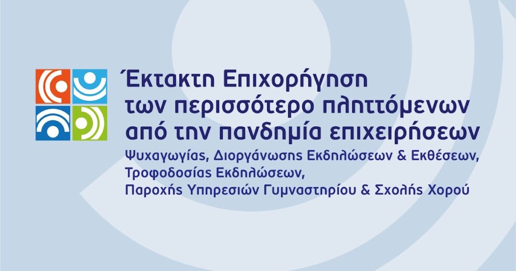 Έκτακτη επιχορήγηση των περισσότερο πληττόμενων από την πανδημία επιχειρήσεων ψυχαγωγίας, διοργάνωσης εκδηλώσεων και εκθέσεων, τροφοδοσίας εκδηλώσεων, παροχής υπηρεσιών γυμναστήριου και σχολής χορού.