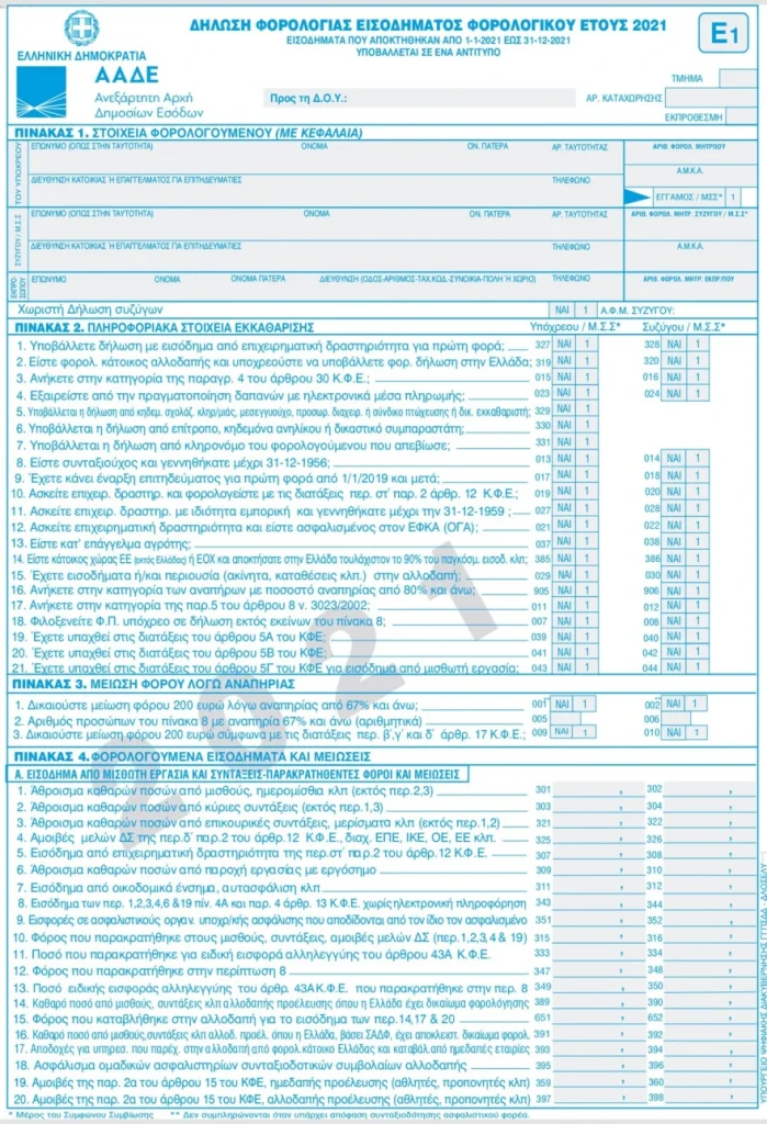 Το έντυπο αυτό αφορά πάνω από 8 εκατομμύρια φορολογούμενους – μισθωτοί, συνταξιούχοι, αυτοαπασχολούμενοι, αγρότες και εισοδηματίες – που θα κληθούν και φέτος να δηλώσουν στην εφορία τα εισοδήματα που εισέπραξαν μέσα στο 2021.