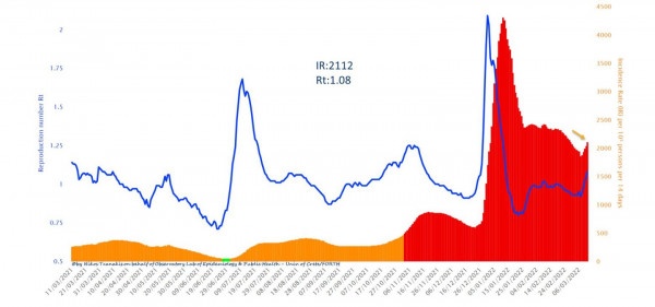 Όπως σημειώνει σε ανάρτησή του, ο καθηγητής Πνευμονολογίας, Νίκος Τζανάκης, τις τελευταίες μέρες «έχουμε μια υποτροπή, με αύξηση 2.500 κρούσματα κατά μέσο όρο την ημέρα και με αύξηση του δείκτη μεταδοτικότητας πάνω από 1 (1.08)».
