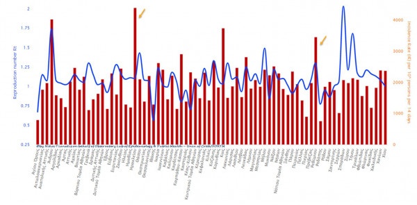 «Βλέποντας μια υποτροπή στον αριθμό των κρουσμάτων την τελευταία βδομάδα, πολλοί με ρωτούν τι συμβαίνει…. Πράγματι έχουμε μια υποτροπή (πρώτη εικόνα – βέλος) τις τελευταίες ημέρες με αύξηση 2.500 κρούσματα κατά μέσο όρο την ημέρα και με αύξηση του δείκτη μεταδοτικότητας πάνω από 1 (1.08)…..