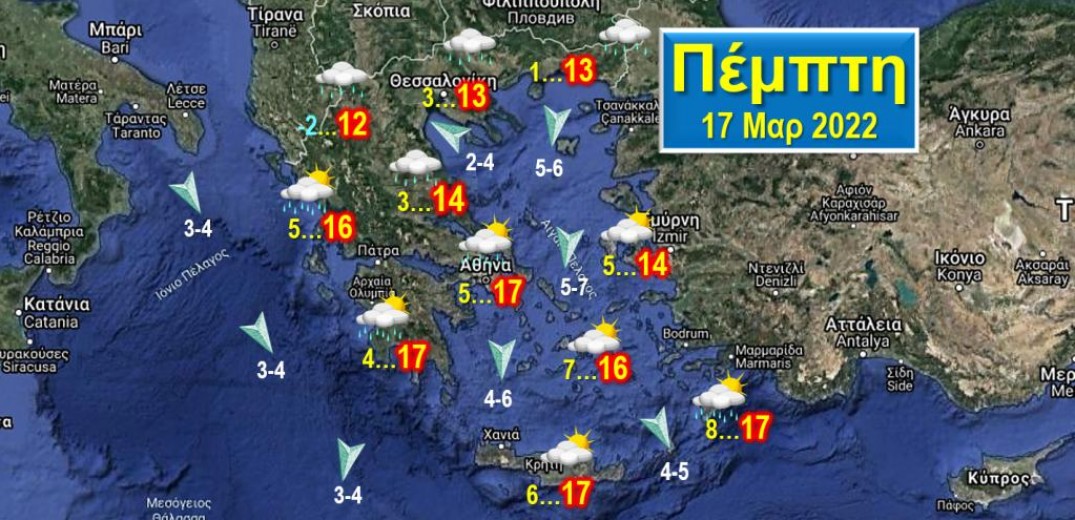 Άνεμοι: Βοριάδες στο Ιόνιο μέτριοι 3-4, στο Αιγαίο τοπικά ισχυροί 5-7 Μποφόρ. Θερμοκρασίες: Στη βόρεια και κεντρική χώρα από -1 έως 14, στη δυτική και νότια και στις νησιωτικές περιοχές από 5 έως 17 βαθμούς.
