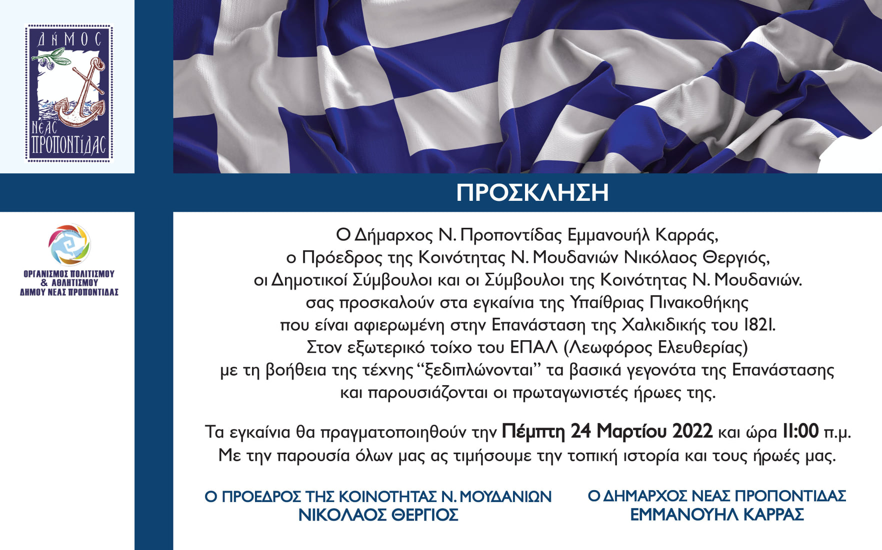Ο Δήμος Νέας Προποντίδας στοχεύοντας στην απόδοση τιμής στους ήρωες προγόνους μας αλλά και στην ανάδειξη της άγνωστης από πολλούς Επανάστασης της Χαλκιδικής δημιούργησε μια υπαίθρια πινακοθήκη, όπου αποτυπώνονται τα σημαντικότερα γεγονότα της επανάστασης στον εξωτερικό τοίχο του ΕΠΑΛ στα Ν. Μουδανιά (επί της οδού Λεωφόρου Ελευθερίας), προκειμένου να είναι προσιτή και επισκέψιμη όλες τις ημέρες και ώρες του χρόνου.