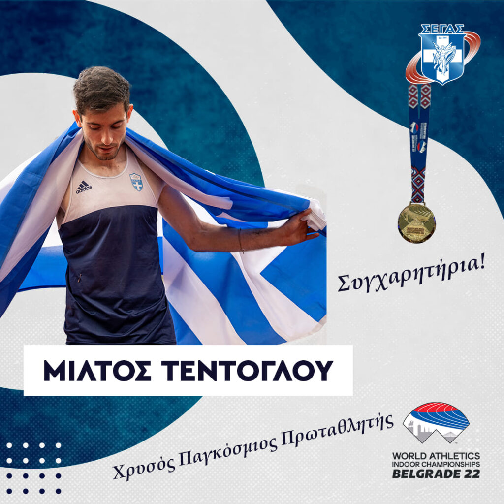 Παγκόσμιος Μίλτος Τεντόγλου! Με άλμα στα 8.55 κατέκτησε το 🥇στο Παγκόσμιο Πρωτάθλημα κλειστού στίβου στο Βελιγράδι. Συνεχίζεις να μας κάνεις υπερήφανους Μίλτο#TeamHellas 🇬🇷#Tentoglou#gold#WABelgrade2022#Belgrade2022 pic.twitter.com/flhLubIvf3