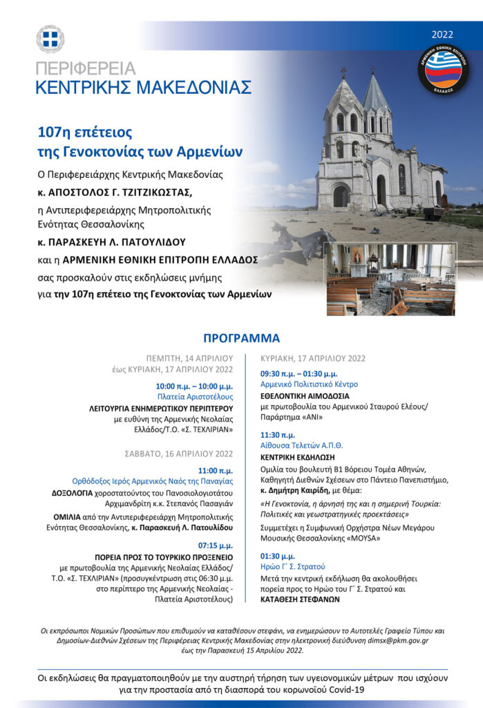 Η Περιφέρεια Κεντρικής Μακεδονίας, η Αρμενική Εθνική Επιτροπή Ελλάδος και η Αρμενική Κοινότητα Θεσσαλονίκης, στο πλαίσιο της επετείου της «Ημέρας Μνήμης της Γενοκτονίας των Αρμενίων από την Τουρκία» ανακοινώνουν το πρόγραμμα των εκδηλώσεων μνήμης για την 107η επέτειο της Γενοκτονίας των Αρμενίων, που θα λάβουν χώρα στην πόλη της Θεσσαλονίκης και θα πραγματοποιηθούν ακολούθως: