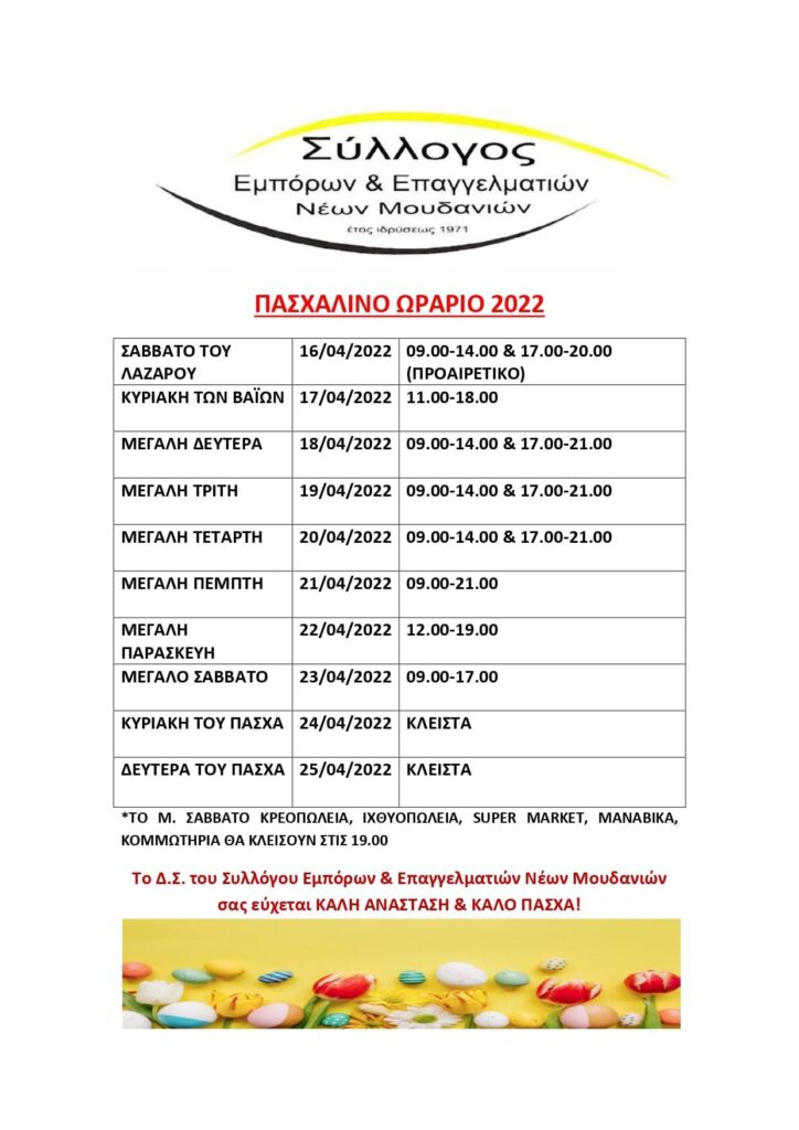 Από τις 16 Απριλίου 2022 ξεκινά το εορταστικό ωράριο των καταστημάτων, όπως ανακοίνωσε ο Εμπορικός Σύλλογος Νεών Μουδανιών.