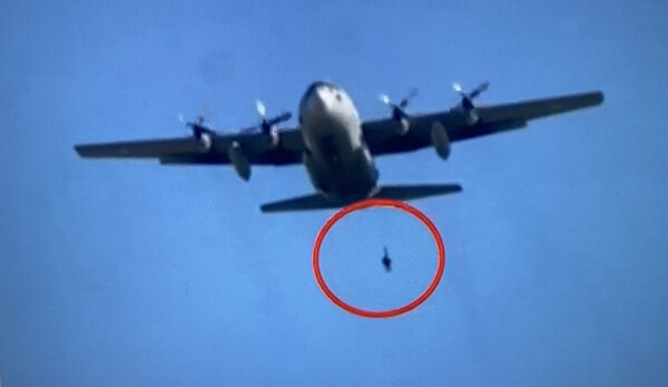 Όταν έφτασε σε ύψος 5.000 ποδιών (1,52 χιλιόμετρα) ξεκίνησε η πτώση των αλεξιπτωτιστών με στατικό ιμάντα. Ο πρώτος άνδρας βγήκε από τα πλάγια του C-130. Ο ιμάντας όμως δεν άνοιξε το αλεξίπτωτο, με αποτέλεσμα ο αλεξιπτωτιστής να μείνει κρεμασμένος στο κενό για αρκετά λεπτά, σε απόσταση 4,5 μέτρων από το αεροσκάφος – όσο δηλαδή είναι και το μήκος του ιμάντα, σύμφωνα με τον δημοσιογράφο Αντώνη Αντωνόπουλο.