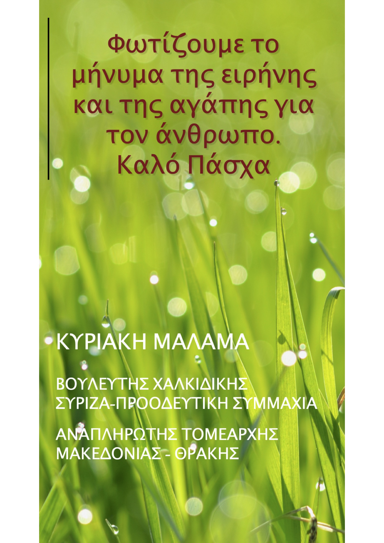 Ευχές για το Πάσχα της Κυριακής Μάλαμα Βουλευτή Χαλκιδικής ΣΥΡΙΖΑ – Αν. Τομεάρχη Μακεδονίας – Θράκης ΣΥΡΙΖΑ.