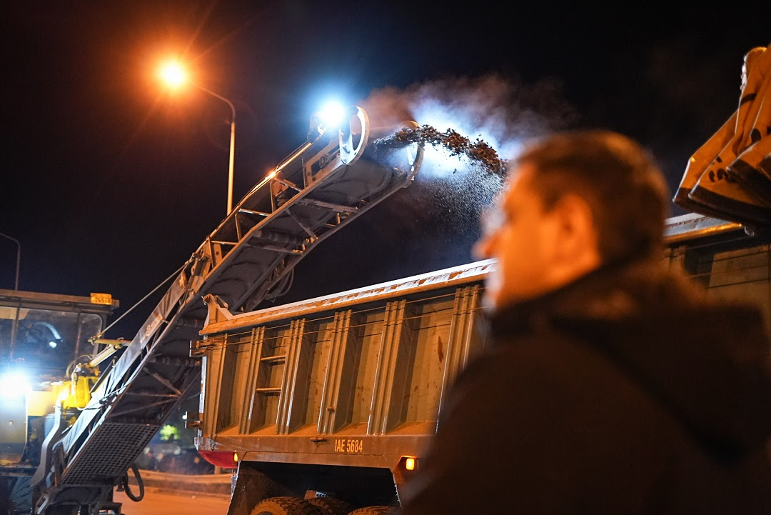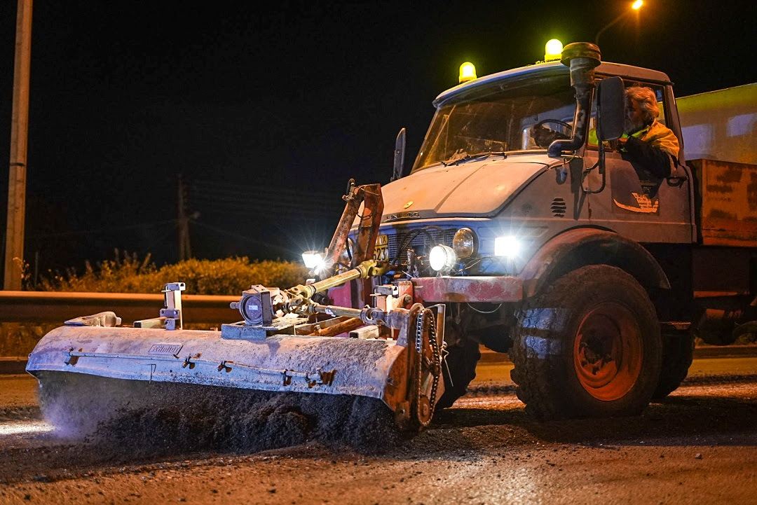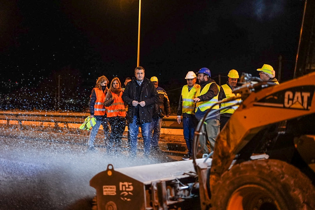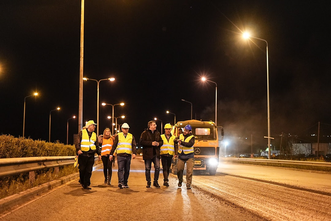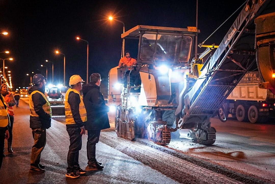 Συνοδευόμενος από τον Αντιπεριφερειάρχη Υποδομών και Δικτύων Πάρη Μπίλλια, ο κ. Τζιτζικώστας επέβλεψε την πορεία των εργασιών και συνομίλησε με τους εργαζόμενους στα συνεργεία για τα οφέλη της νυχτερινής υλοποίησης της ασφαλτόστρωσης.