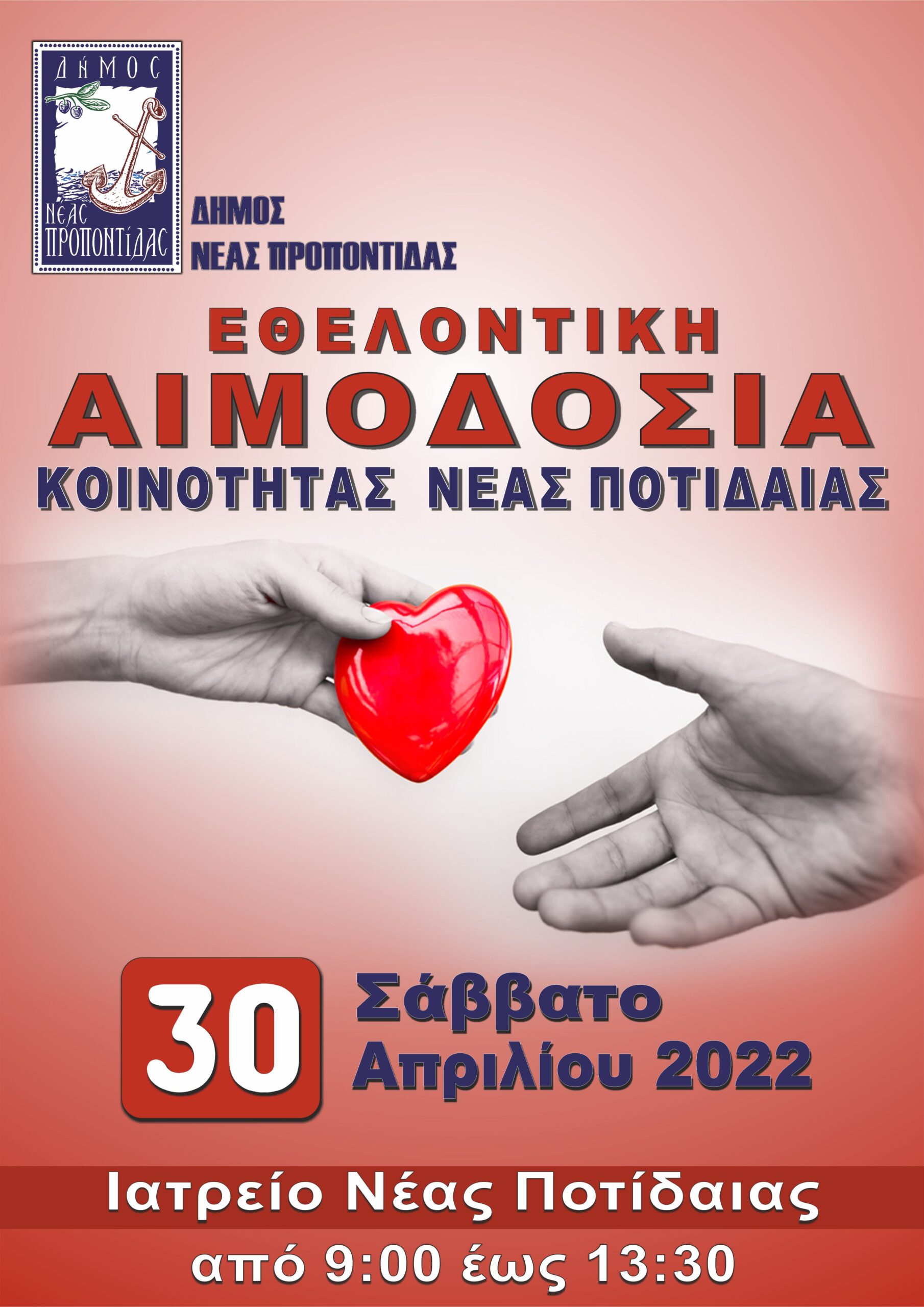 Σε εξέλιξη βρίσκεται η Εθελοντική Αιμοδοσία Κοινότητας Ν. Ποτίδαιας σήμερα Σάββατο 30 Απριλίου 2022 και ώρες 9:00 π.μ. έως 13:30 μ.μ. στο Ιατρείο Ν. Ποτίδαιας.