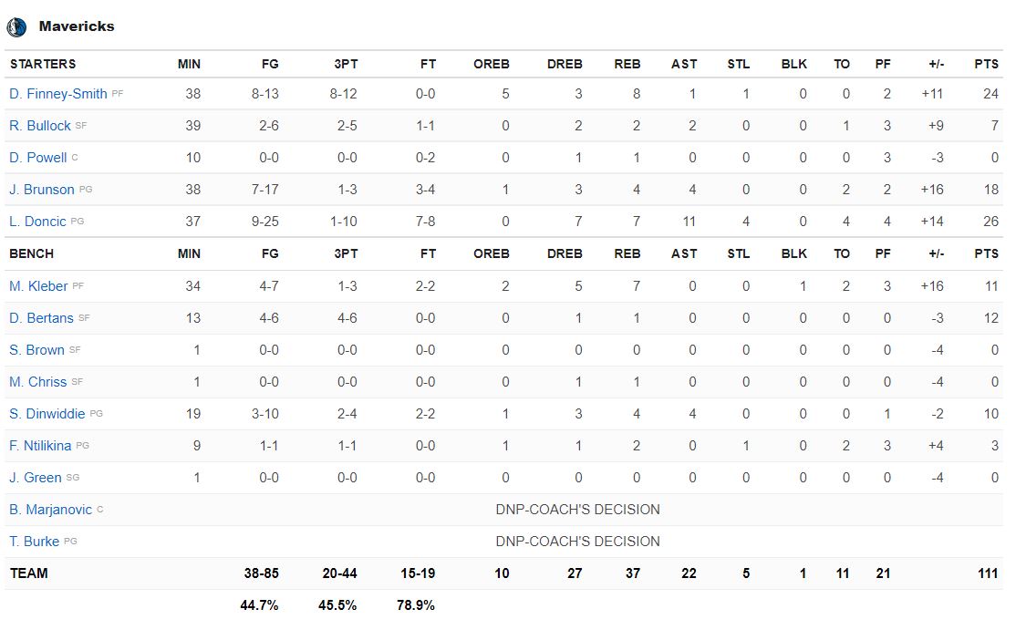 Συγκεκριμένα τελείωσε το παιχνίδι έχοντας 24 πόντους με 8/12 τρίποντα και 8 ριμπάουντ! Συνολικά οι Μαβς μέτρησαν 20/44 τρίποντα, δηλαδή ποσοστό της τάξεως του 45,5%. Την ίδια ώρα οι Σανς είχαν ευστοχήσει σε λιγότερα από τα μισά (9/25), κάτι που είχε δυσκολέψει εκ των πραγμάτων το έργο τους για πιθανή διεκδίκηση της νίκης. Πρώτος σκόρερ των Ντάλας Μάβερικς ήταν ο Λούκα Ντοντσιτς με 26 πόντους, ο οποίος είχε επίσης 11 ασίστ, 7 ριμπάουντ και 3 κλεψίματα σε 37 λεπτά συμμετοχής.
