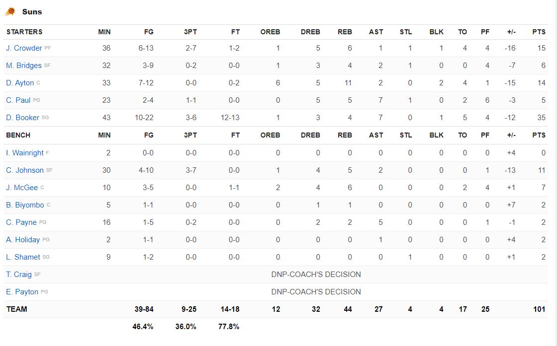 Το μεγάλο πρόβλημα για το Φοίνιξ στην έκβαση του αγώνα είχε να κάνει με τα φάουλ του Κρις Πολ (5π., 7ασ., 5ριμπ. ο οποίος αποβλήθηκε στις αρχές της 4ης περιόδου. Κάτι που επηρέασε την ομάδα του Μόντι Ουίλιαμς όσον αφορά την οργάνωση και τον τρόπο λειτουργίας της. Ο Ντέβιν Μπούκερ έκανε τα… πάντα (35π., 10/22 σουτ, 12/13 βολές, 7 ασίστ 4 ριμπάουντ) αλλά δεν μπόρεσε να αποσοβήσει την ήττα της ομάδας του. Κράουντερ (15π., 6/13σ.) και Έιτον (14π., 11ριμπ.) ήταν εκείνοι που προσπάθησαν να βοηθήσουν τον Μπούκερ.