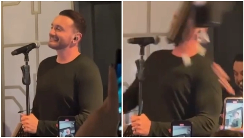 Στο video που έχει γίνει viral τις τελευταίες ώρες διακρίνεται να τραγουδάει στο μαγαζί στην Θεσσαλονίκη όπου εμφανιζόταν, όταν ξαφνικά του σκάει ένας δίσκος με λουλούδια στο πρόσωπο.