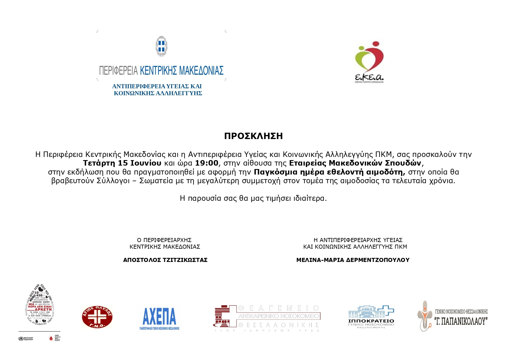 Η Περιφέρεια Κεντρικής Μακεδονίας και η Αντιπεριφέρεια Υγείας και Κοινωνικής Αλληλεγγύης, σε συνεργασία με το Εθνικό Κέντρο Αιμοδοσίας (ΕΚΕΑ) και τα νοσοκομεία της Θεσσαλονίκης «Άγιος Παύλος», ΑΧΕΠΑ, Θεαγένειο, Ιπποκράτειο και «Γ. Παπανικολάου» συνδιοργανώνουν διήμερο εκδηλώσεων στο πλαίσιο του εορτασμού της Παγκόσμιας Ημέρας Εθελοντή Αιμοδότη.