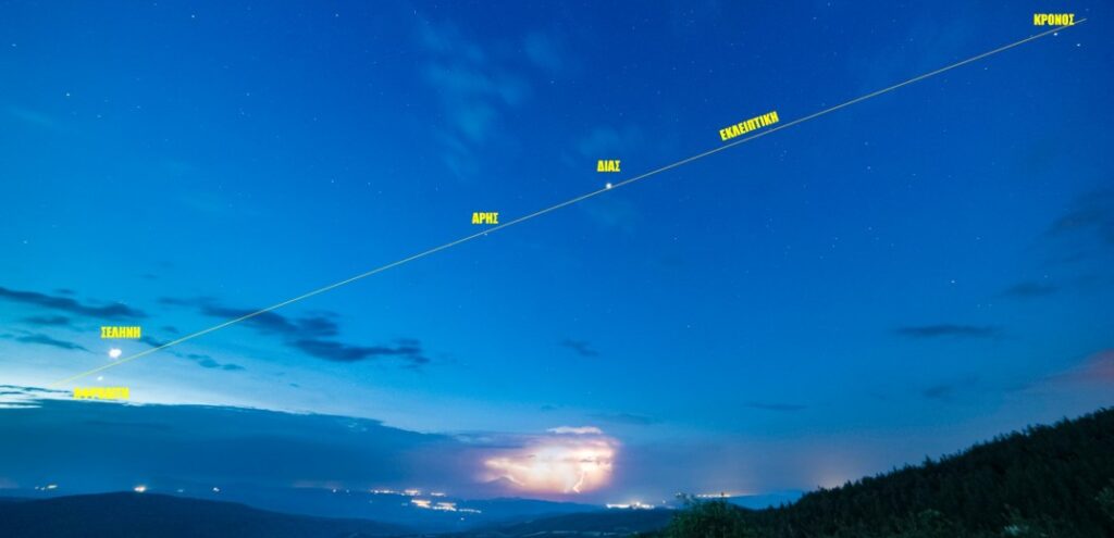 Ένα σπάνιο φαινόμενο, την ευθυγράμμιση πέντε ουράνιων σωμάτων, κατέγραψε ο φωτογράφος και ερασιτέχνης αστρονόμος Κωνσταντίνος Εμμανουηλίδης στον ουρανό της Χαλκιδικής, και μάλιστα με τη σφοδρή καταιγίδα που χτύπησε όλη την περιοχή να φαίνεται καθαρά στο βάθος της φωτογραφίας.