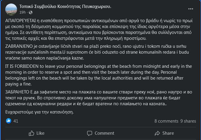 «ΑΠΑΓΟΡΕΎΕΤΑΙ η εναπόθεση προσωπικών αντικειμένων από αργά το βράδυ ή νωρίς το πρωί με σκοπό τη δέσμευση κομματιού της παραλίας και επίσκεψη της ίδιας αργότερα μέσα στην ημέρα. Σε αντίθετη περίπτωση, αντικείμενα που βρίσκονται παρατημένα θα συλλέγονται από τις τοπικές αρχές και θα επιστρέφονται μετά την πληρωμή προστίμου».