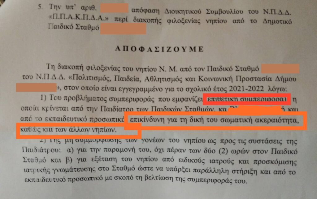 Τον Απρίλιο του 2022 πήγαμε και σε αναπτυξιολογο όπως ήταν οι οδηγίες μας. Ο αναπτυξιολόγος δεν διέγνωσε κάτι που να κρίνει την αποβολή του παιδιού μας από τον σταθμό, ούτε καν θεώρησε ότι έπρεπε να πάει σε ειδικό σχολείο. Το μόνο που μας είπε είναι ότι χρειάζεται παράλληλη στήριξη, ούτε ότι είναι επικίνδυνος ούτε φτηνές δικαιολογίες επειδή δεν θέλει ο σταθμός να ασχοληθεί με το παιδί. Όπως γράφει η απόφαση του σταθμού, πράγματι μας είχαν ενημερώσει να τον πηγαίνουμε μόνο για δύο ώρες ενώ στην αρχή ήταν όλα καλά. Δεν ήταν εύκολο όμως να τον αφήνουμε λιγότερο από 4 ώρες, και αυτό τους το καταστήσαμε εγγράφως. Γράφουν ψέματα ότι τάχα δεν κάναμε τίποτα για το παιδί! Οι λόγοι που επικαλούνται για την αποβολή του και αναφέρονται στην απόφαση, δεν ισχύουν. Έχω ενημερώσει σχετικά το υπουργείο παιδείας αλλά το υπουργείο πετάει το μπαλάκι στον δήμο γιατί ήταν σε δημοτικό παιδικό σταθμό. Γενικά ένα μπάχαλο και όχι μόνο. Στον συγκεκριμένο παιδικό σταθμό οι παιδαγωγοί δεν έχουν γνώσεις πρώτων βοηθειών και έχω να πω πολλά ακόμα”.