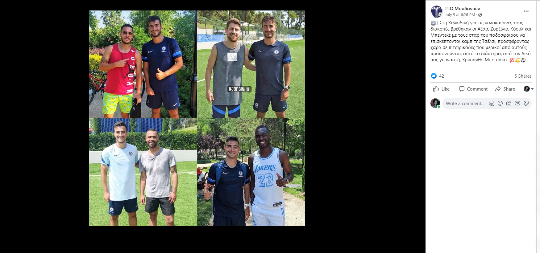«Στη Χαλκιδική για τις καλοκαιρινές τους διακοπές βρέθηκαν οι Αζάρ, Ζορζένιο, Κόουλ και Μπεντεκέ με τους σταρ του ποδοσφαίρου να επισκέπτονται καμπ της Τσέλσι, προσφέροντας χαρά σε πιτσιρικάδες που μερικοί από αυτούς προπονούνται, αυτό το διάστημα, από τον δικό μας γυμναστή, Χρύσανθο Μπετσάκο».